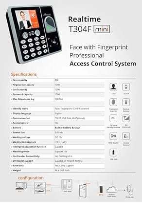 The Realtime T304F offers impressive storage and processing capabilities. It can store up to 3,000 face templates, 10,000 fingerprints, and 100,000 attendance records, making it suitable for both small offices and large enterprises. The system?s high-speed processor ensures that recognition and data processing occur within milliseconds, minimizing delays during peak check-in and check-out times.
